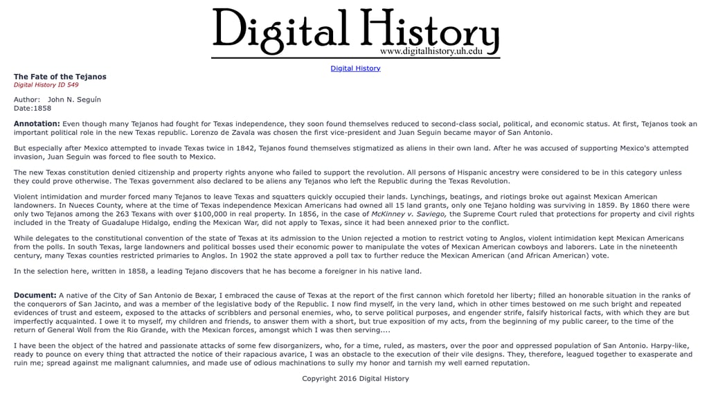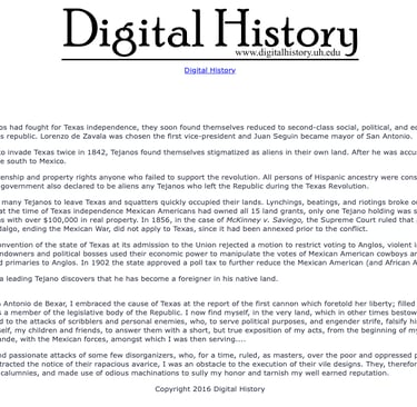 The history of Texas is unique in its beginnings. The only U.S. state to be its own country sets it apart from the other states. But it also has a tragic history in its dealings with the Mexican people, Americans of Mexican heritage, and Tejanos after the ratification of the Treaty of Guadalupe - Hidalgo. You will find on this site a collection of documents, articles, stories of the people who resolved to endure the many hardships for equality. Some of these stories you may not have heard before. They may shock you, disgust you, but do not